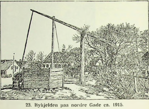 Men på den nordre gade måtte de være fælles om den, som lå ud for Snedkerbækken, som afløsning for den gamle vippebrønd, der afskaffedes i 1915. (Snedkerbækken var en sti, som gik nord for rytterskolen mellem de to gader). Folk gik med åg over skuldrene, når de hentede vand, og skulle de skylle tøj, bar de tøjet ned til bykjelden her (bykilden, red.). Om vinteren kunne pumpen fryse, så man måtte have varmt vand til at tø den med.
