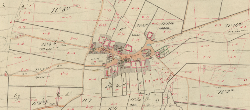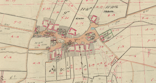 Kilde: Matrikelkort over Toustrup By, 1856, Landinspektør Jens-Erik Schiøtt Svensson, Aakjaer Landinspektører – Et nærbillede