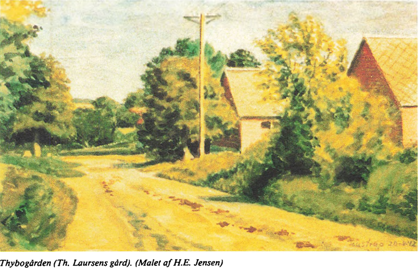De fleste af gårdmændene var fæstere under Frijsenborg, men i årene 1852-55 købte de deres gårde og blev selvejere. Grev Frijs til Frijsenborg var en ædel mand, der overlod dem gårdene på billige vilkår. Til tak herfor oprejste bønderne ham, endnu medens han levede, en mindesten på Frijsenborg. Bønderne byggede, med hjælp af de dårligt uddannede landsbyhåndværkere, selv deres huse. Når skolen undtages, var der i min barndom ingen grundmurede huse i byen og selvfølgelig heller ingen med tegltag. Der var heller ikke fod under stolperne; de stod på sten med et stykke tømmer imellem. Væggene var sat op af flettede hasselstokke med påklinet ler. Indervæggene var dog opført af hjemmelavede lersten. Gulvene i stuehusene var af stampet ler.