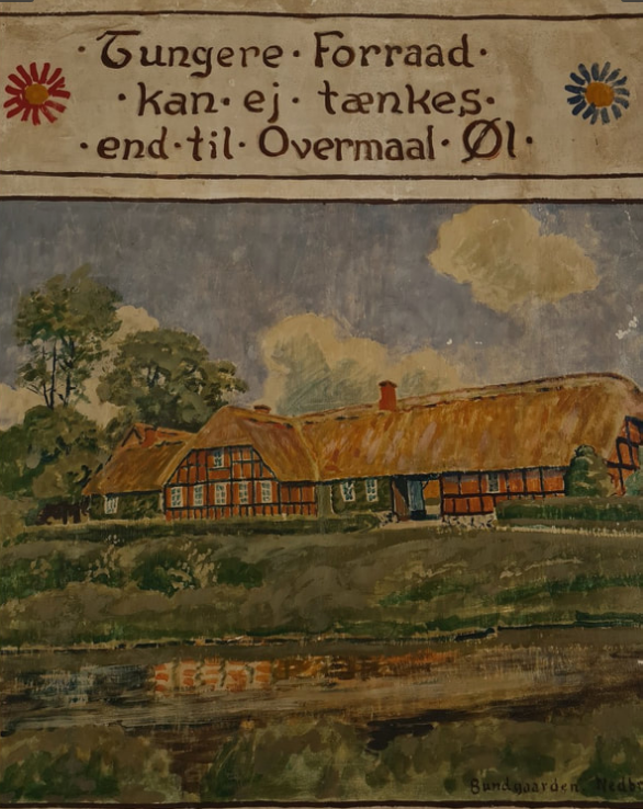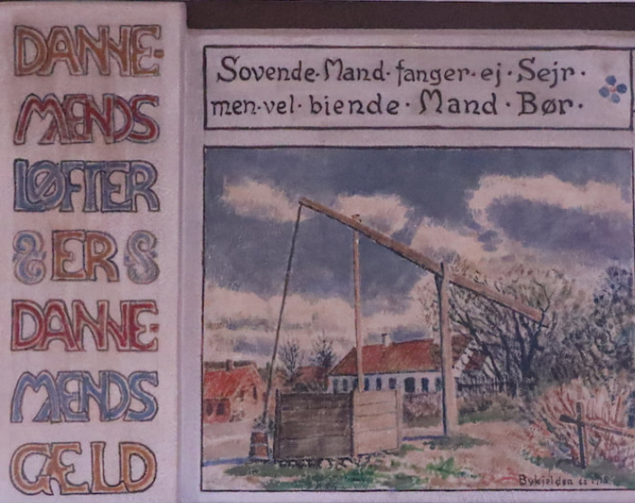 Kilde: Toustrup Forsamlingshus’ hjemmeside: Gavlmaleriet af H. E. Jensen, udført i 1934. Maleriet forestiller et byting.