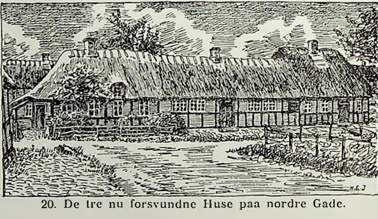 Bundgården, den nederste og lavest liggende i byen, om ikke det var den ældste, så var det ubetinget den kønneste og kønnest beliggende gård i byen. Fra den har far (H. E. Jensen, red.) hentet utallige motiver, og en del af dem er afbilledet i Forsamlingshuset. Desværre brændte den en januar morgen i 1939, den nedbrændte totalt.