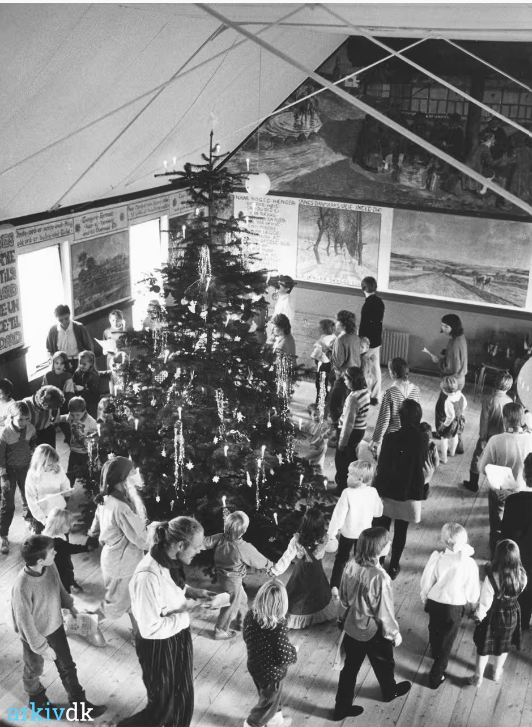 I mange år har der været tradition for adventsfest, juletræsfest og julefrokost i Toustrup Forsamlingshus i den samme weekend – for børn og voksne. Her er et billede af børn og voksne til en juletræsfest i 1986 og en kagebagningskonkurrence i 1987.