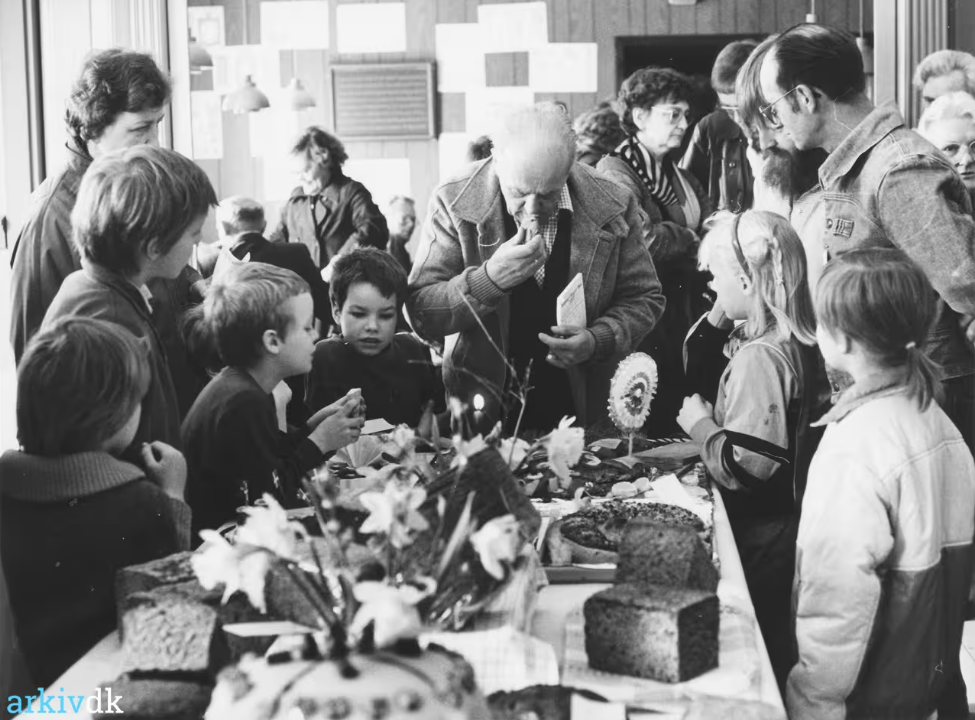 Dommeren bagermester Helmer Røhling fra Sorring smager en kage, med nysgerrige tilskuere rundt om. Kilde: Arkiv.dk, avisbillede i Midtjyllands Avis, 1987, foto Leif Tychsen