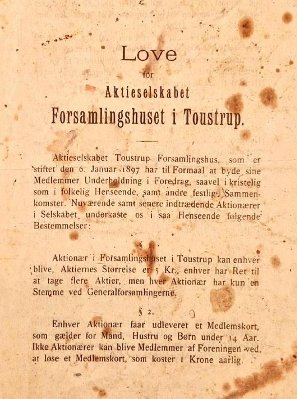 Kilde: Love og vedtægter Toustrup Forsamlingshus, 1897, Silkeborg Arkiv
