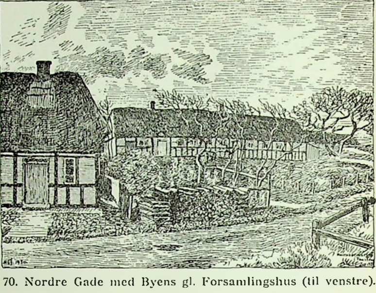 ”Hvad angår det åndelige liv, har forsamlingshusene jo spillet en vigtig rolle, større end nu; men sådan er det jo overalt. Til at begynde med havde man forsamlingslokale i det vestre af de tre sammenbyggede huse på nordre gade i Toustrup (Ryttervej, red.) (Se Fig. 20). Men i 1897 blev forsamlingshuset bygget lidt uden for byen mod øst.”