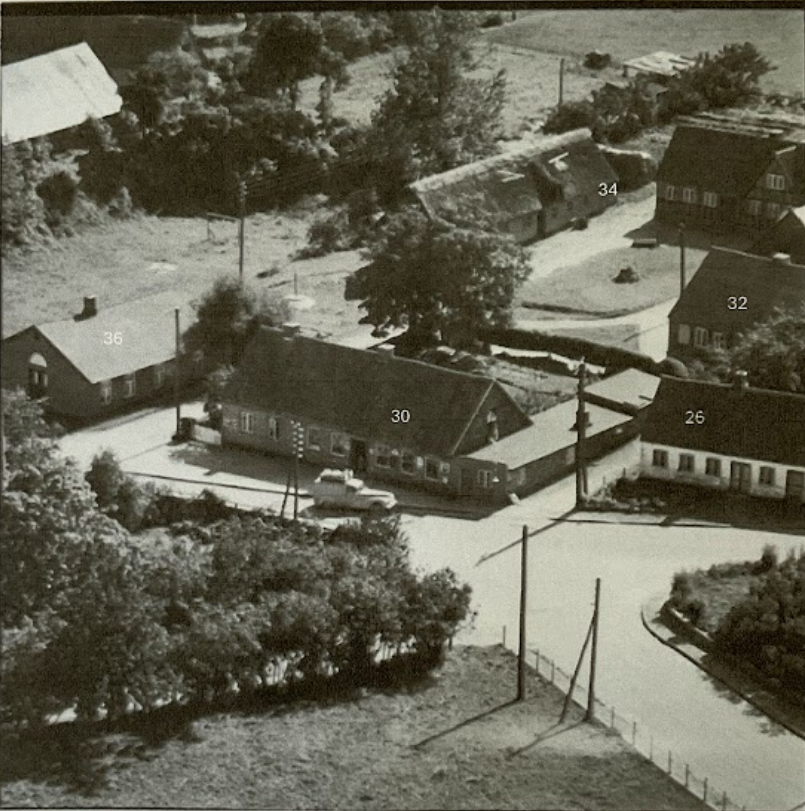 Kilde: Billede af Toustrup Missionshus, Johannes Jensensvej 36 (nr. 36 er markeret på billedet) venligst udlånt af Svend Aage Mikkelsen, Sorring (der selv er født i nr. 26). Bygning nr. 30 er den gamle købmand. Bemærk den traditionelle bue over døren i 36.